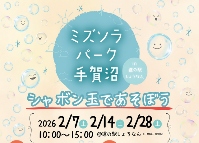 「シャボン玉であそぼう」をテーマに、道の駅しょうなんの水と空を感じられる特別空間「ミズソラパーク手賀沼」を2月の土曜日に3回開催します!道の駅の各エリアでいろいろなイベントを実施しますので、ぜひご家族やご友人とお越しください!