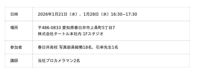 東海地方で25店舗のフォトスタジオを運営する株式会社タートル(本社:愛知県春日井市、代表取締役社長:亀山直樹)は、2026年1月21日(水)と2026年1月28日(水)、愛知県立春日井高校(以下:春日井高校)の写真部員を対象としたスタジオ撮影講座を開催いたしました。当日は、弊社社員が講師を務め、スタジオ撮影ならではのライティングや構図の考え方など、実践的な技術を学生の皆さんにお伝えしました。