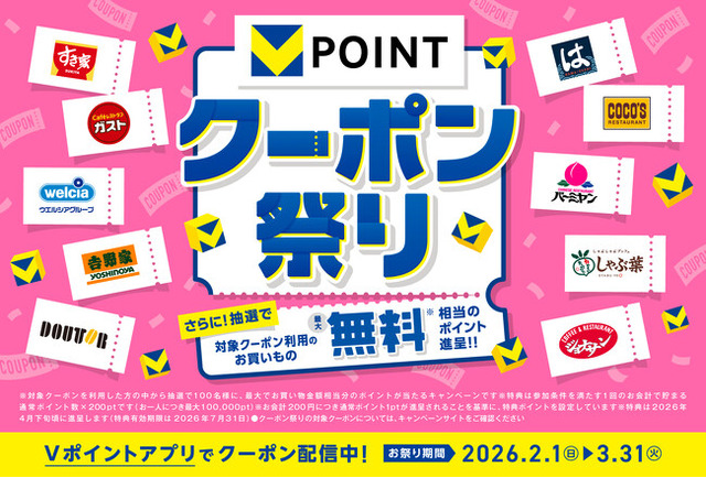CCCMKホールディングス株式会社(本社:神奈川県横浜市、代表取締役社長兼CEO:高橋 誉則、以下「CCCMKHD」)は、2026年2月1日(日)から3月31日(火)まで、Vポイントがお得に貯まる「クーポン祭り」(https://vpoint.net/vc2)を開催します。モバイルVカード対応店舗全店で使える「毎週配信!1週間ずっと2倍クーポン」や、さまざまなVポイント提携先の利用でVポイントがもらえるクーポンなど、通常よりもお得にお買い物やお食事を楽しめるキャンペーンです。さらに抽選で、最大でお買い物金額相当分のVポイントが当たる「お買い物最大無料キャンペーン」も実施します。