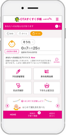 このアプリでは、お子様の成長記録や、妊娠届出・子育て相談の予約などができ、妊娠・出産・子育ての情報を受け取ることができます。日々育児に奮闘されている皆様にとって、使いやすい機能を充実させてまいりますので、ぜひ『OTAすくすく手帳』をご活用ください。