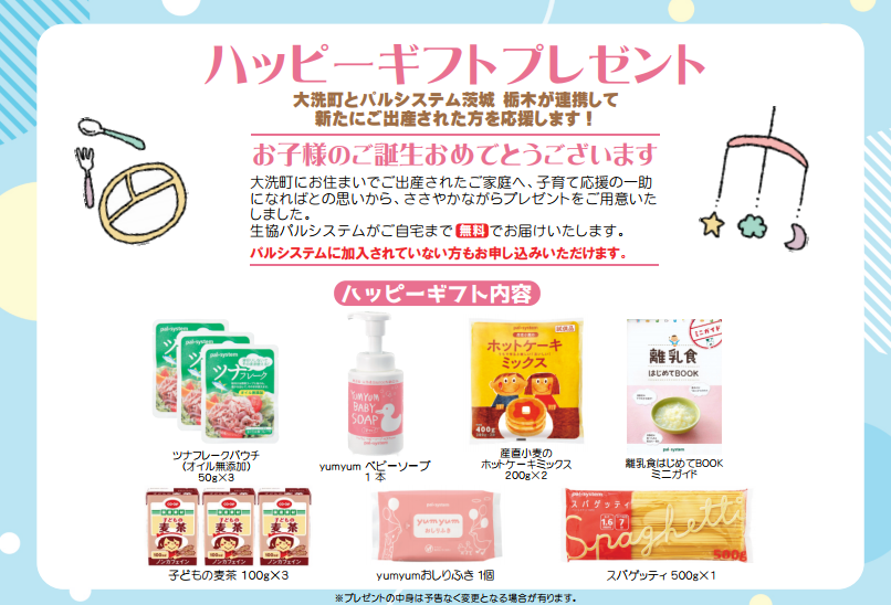 生活協同組合パルシステム茨城 栃木(本部:水戸市梅香、理事長:青木恭代)と大洗町(國井豊町長)は2月2日(月)から、町内で希望された乳児家庭へ提供する「ハッピーギフトプレゼント」の申請受け付けを開始します。大洗町との子育て支援推進における連携合意書に基づき、新生児を迎えた世帯へ育児に活用できる商品の詰め合わせを出生祝いとして届けます。