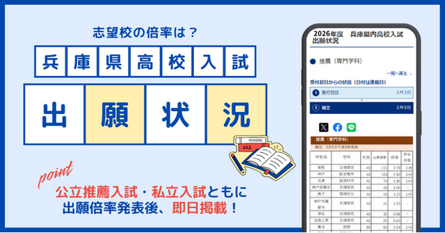 神戸新聞の電子版「神戸新聞NEXT」では、兵庫県の公立高校推薦入試、私立高校入試の出願状況を、2月3日より速報します。出願開始から志願変更、最終確定まで、複数回にわたって速報するため、志望校の状況確認や出願変更を考える際の判断材料として活用できます。