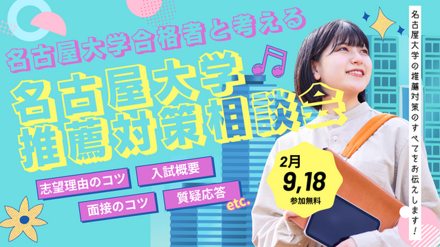総合型選抜・推薦入試専門塾のルークス志塾(運営:Loohcs株式会社)は、名古屋大学をはじめとする難関国立大学の推薦入試を目指す高校生を対象に、「名古屋大学 推薦入試対策相談会」を2026年2月9日(月)・18日(水)にオンラインで開催します。本イベントでは、名古屋大学推薦入試の合格者が登壇し、実際に行った対策や準備のステップ、専門知識の磨き方などを詳しく解説します。