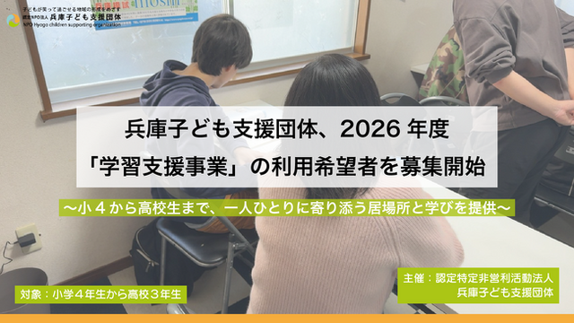 認定NPO法人兵庫子ども支援団体(所在地:兵庫県明石市、代表理事:多田実乘、以下「当法人」という)は、2026年度の学習支援参加者の募集を2026年2月3日(火)から2026年2月15日(日)まで行います。