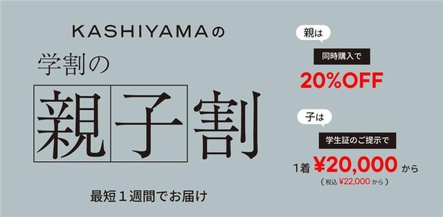株式会社オンワードパーソナルスタイル(本社:東京都港区 代表取締役社長:関口 猛)が展開するオーダーメイドの『KASHIYAMA』は、学生向け「学割」が大変好評をいただいていることを受け、学生と同時に購入した両親のスーツが20%OFFとなる「親子割」を、2026年2月2日(月)から全国・全店舗にて開始しました。本キャンペーンでは、学生が「学割 (税込 ¥22,000円 OFF)」を利用してスーツを購入した場合、同伴する両親がスーツを購入すると、全生地対象で20%OFFが適用されます。