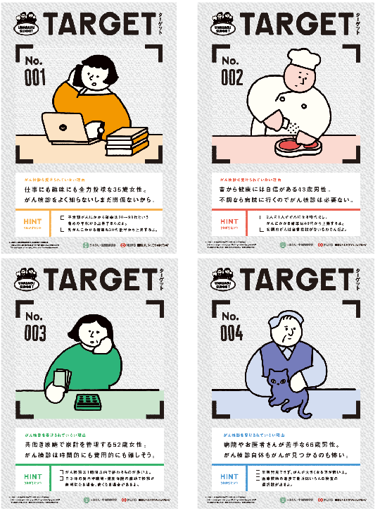 インプットワークで「がん検診」を受けてがんを早期発見・早期治療する大切さを学んだ生徒たちに、日本の大人たちのがん検診受診率の低さ、保護者世代である40代からのがん罹患リスク、がん教育の受講状況などの課題をまずは認識してもらいます。その上で4人の架空ターゲットの中から1人を選び、「がん検診」を受けられていない理由に着目しながら、「がん検診」をうながすための作戦(声かけ・働きかけ)を考える体験型のワークです。