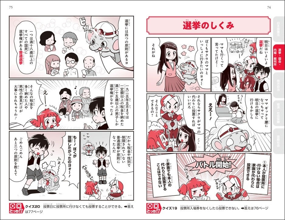 登場するキャラクターたちが政治についてのカードで対決しながら政治を学んでいきます。読者もいっしょに参加できるカードバトルなので記憶に残りやすく、難しいと思われがちな政治を楽しく学べます。とにかく分かりやすいまんがですが、重要事項はしっかり盛り込んでいるのでまんがを読むだけで政治の知識が身につきます。
