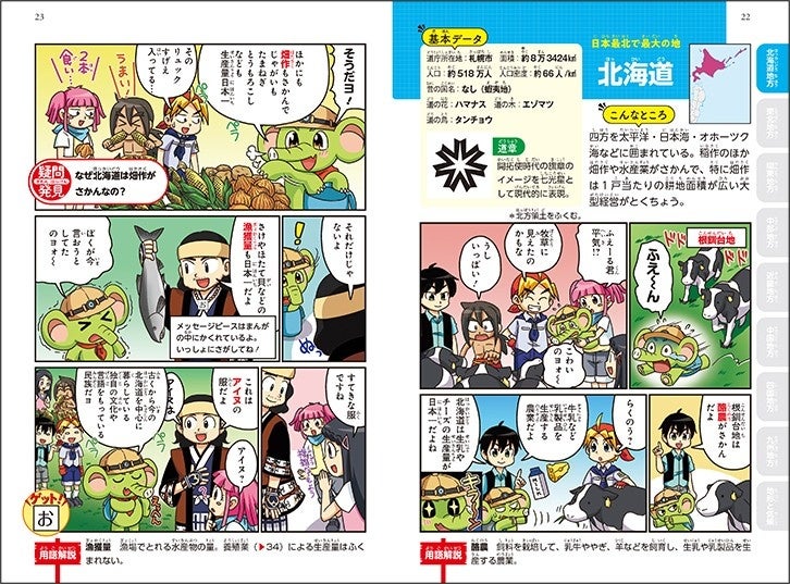 登場するキャラクターたちが日本一周の旅に出て、各地の特色や47都道府県の特色や自然・産業・伝統文化などを学んでいきます。各ページで「なぜ?」を考える要素を盛り込んでおり、その背景や要因を探る地理的思考力が身につきます。
