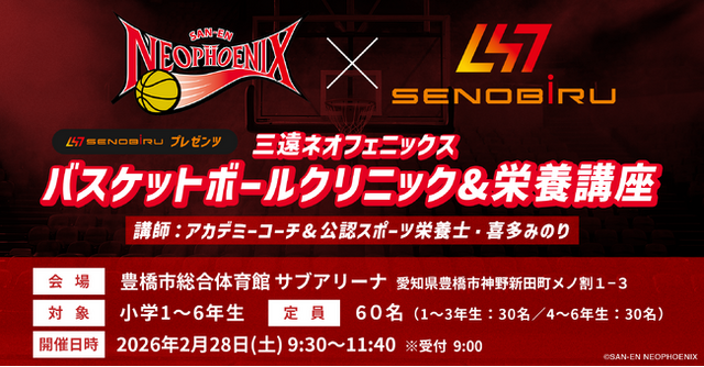 世界を目指すアスリートを応援するサプリメントブランド「SENOBIRU(セノビル)」を展開する株式会社エメトレ(所在地:東京都千代田区、代表取締役:千明 哲治、以下「エメトレ」)は、B.LEAGUE・三遠ネオフェニックスと2026年2月28日(土)、愛知県豊橋市にて【バスケットボールクリニック&栄養講座】を開催いたします。