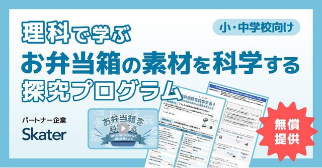 今回はその第八弾として、お弁当箱をはじめ、さまざまな日用品を展開するスケーター株式会社と連携した「理科で学ぶお弁当箱の素材を科学する探究プログラム」を提供いたします。
