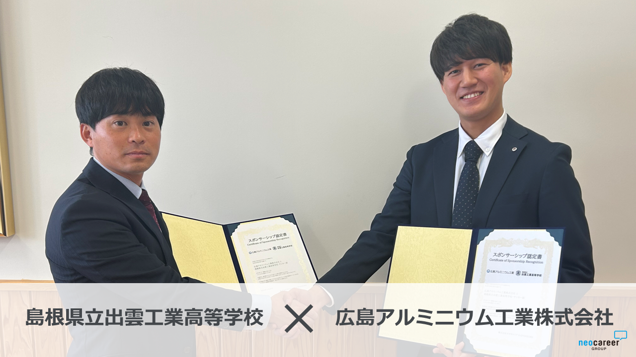 人材総合サービスを展開する株式会社ネオキャリア(本社:東京都新宿区、代表取締役CEO:西澤 亮一、以下「ネオキャリア」)は、自社が運営する企業と高校部活動をつなぐスポンサーマッチングサービス「Bスポンサーズ」を通じて、広島アルミニウム工業株式会社(本社:広島県広島市、代表取締役社長執行役員:小松 理央、以下「広島アルミニウム工業」)が、島根県立出雲工業高等学校(所在地:島根県出雲市、以下「出雲工業高校」)のスポンサーに就任したことをお知らせいたします。なお、本取り組みでは、同校サッカー部を起点とした活動支援を予定しています。