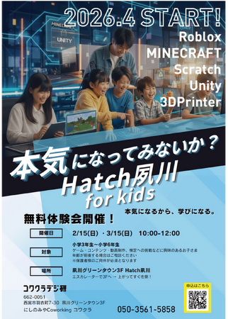 にしのみやCoworking コワクラ(兵庫県西宮市、代表:サウンズファン株式会社 上原 英司)は、2026年4月より、IT・ゲームに特化した次世代型学童保育「Hatch夙川 for kids」を開校いたします 。これに先立ち、2026年2月15日(日)に、実際にゲーム制作やプログラミングを体験できる無料体験会を開催することをお知らせいたします 。