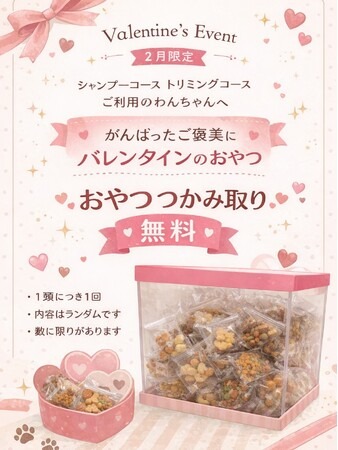 Pets Tokyo西大井店では、2月1日~28日の期間中、シャンプーコース・トリミングコースご利用で“おやつのつかみ取り”に無料でご参加いただけます。いつもお買い上げいただいている飼い主様はもちろん、まだ試したことのない飼い主様も、この機会に是非 "愛犬の好き" を見つけてみてはいかがでしょうか?■ キャンペーン詳細はこちら