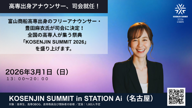 一般財団法人高専人会(所在地:東京都品川区、理事長:渋谷 修太、以下「高専人会」)は、「KOSENJIN SUMMIT 2026」の司会として、国立富山商船高専(現・富山高等専門学校)出身で、フリーアナウンサーとして活躍中の豊田麻衣氏が就任することをお知らせいたします。