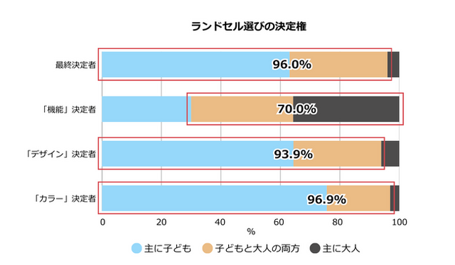 最終的に購入した(購入する)ランドセル・通学カバンを決めるのは、「主に子ども」または「子どもと大人の両方」と回答した方が96%を占め、子どもの意見を尊重するご家庭が多いことがわかりました。さらに細かく見ると、「機能」は大人が70%、「デザイン」「カラー」は子どもがそれぞれ90%以上の決定権をもつことがわかりました。