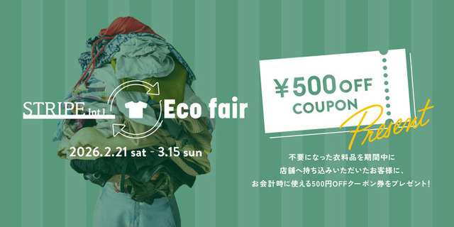 昨年9月の実施に続き、2月21日(土)から3月15日(日)までの期間限定で『STRIPE Eco fair』を開催いたします。期間中、衣料品をお持ち込みいただいたお客様には、全国のストライプインターナショナル店舗および自社ECサイト「STRIPE CLUB」でご利用いただける500円OFFクーポン券をプレゼントいたします。この機会にぜひお近くの店舗へお越しいただき、環境保全活動にご協力ください。
