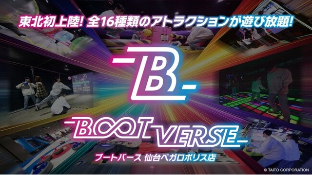 「BOOTVERSE」は仲間(グループ)で楽しめる体験をテーマにまるでパーティーのように楽しめる“パーティースポーツ”を集めたスポーツ×エンタメ施設です。海老名ビナウォーク店と多摩センター新丘の上パティオ店に加え、新たに仙台ベガロポリス店を展開しています。タイトーのゲームIPを活用したオリジナルのスポーツコンテンツのほか、海外で人気のコンテンツなどを導入し、リアルとデジタルが融合した世界観で「ワクワク」「ドキドキ」を体験することができます。[画像10: https://prcdn.freetls.fastly.net/release_image/41970/691/41970-691-0349c77519c70d64970266bcf8e3e25f-455x303.jpg?width=536&quality=85%2C75&format=jpeg&auto=webp&fit=bounds&bg-color=fff ]