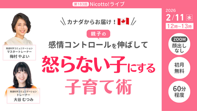 (株)パステルコミュニケーション(本社:東京都豊島区、代表取締役:吉野加容子)が運営する、発達障害・グレーゾーンの子どもを育てるママがいつでも学べて相談できるオンライン子育て塾「Nicotto!塾」は、2026年2月11日(水)お昼12時より、「カナダからお届け!親子の感情コントロールを伸ばして怒らない子にする子育て術」をテーマにオンラインライブを開催いたしますhttps://desc-lab.com/nicotto202201/?prt0211
