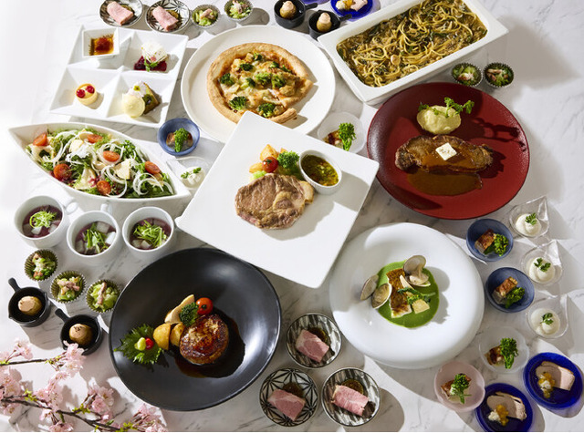 新じゃがや菜の花、春キャベツなどを使った10種のタパスや、山菜とシラスを使ったパスタにシーフードのピザ、筍と海藻のサラダ、スープにカレーなどをブッフェスタイルでお好きなだけお召しあがりいただけます。春の香草を使ってソテーした肉厚な東京のブランドポーク“TOKYO X”など4種類からお選びいただけるメイン料理と、桜を使ったデザートなど4種の盛合せはコーススタイルで、テーブルまでスタッフがお持ちします。平日限定食べ放題デザートも2種類あり、ご家族やご友人とのお花見後にご利用いただくのにぴったりです。