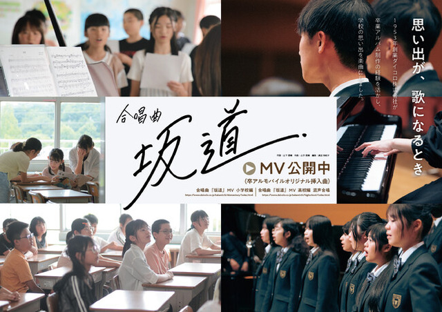 今回、多くの学校から寄せられていた「卒業アルバムに使える合唱曲を」という要望に応えるため、ご自由にお使いいただける自社オリジナルの卒業 ソング『坂道』をギタリスト・作曲家 山下俊輔氏と共に制作いたしました。本曲には、学生時代の喜怒哀楽や友との思い出を重ね、卒業の瞬間だけでなく、 5年後、10年後にも聴く人の記憶を呼び起こす存在になってほしいという願いが込められております。卒業と聞けばこの曲が口ずさまれるような、全国で親しまれる卒業の定番曲へと成長することを目指しております。