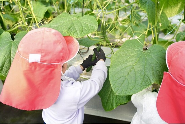 体験の冒頭、スタッフから「きゅうりの成長過程」や「収穫のコツ」、そして「最新の農場設備」についての事前説明を行いました。園児の皆さんは真剣な表情で耳を傾け、最先端の農業の姿に興味津々の様子でした。
