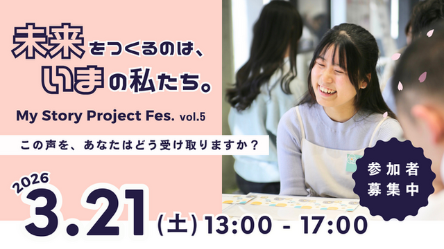 NPO法人Grow & Leap(所在地:愛知県名古屋市、代表理事:倉田佳代子)は、2026年3月21日(土)、名城大学社会連携ゾーン shakeにて、「My Story Project Fes. vol.5」を開催します。本イベントでは、対話を通して中高生の声と大人のまなざしが交差し、新しい価値観や社会のあり方が芽吹く場となることを目指します。
