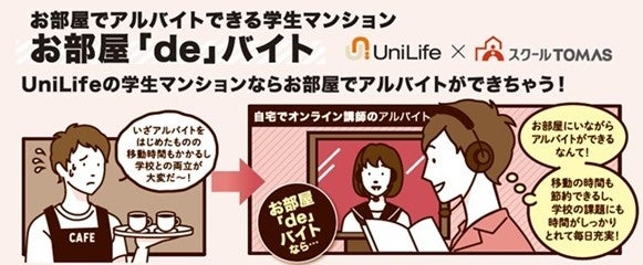 勉強やサークル活動で忙しくても「やりがいのあるバイトがしたい」「将来に繋がる成長できるバイトがしたい」そんな思いを叶えてくれるのが「お部屋「de」バイト」!ご入居のお部屋で個別指導塾講師(オンライン講師)のアルバイトができます。柔軟な就労機会を得ることができると同時に、生徒との対話を通して指導や、寄り添い、共感といった経験を得られる自身の成長に繋がるアルバイトです。2026年4月よりサービス開始予定です。