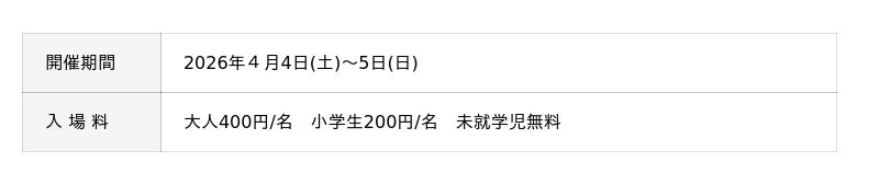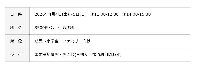 [表5: https://prtimes.jp/data/corp/78115/table/213_5_50b5a42720e5d53b103f055323642a40.jpg?v=202602120146 ]※入場料は日帰りのお客様のみいただきます。(ご宿泊のお客様は無料)