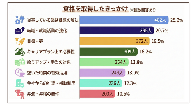 資格取得の動機は、時代背景を表すのでは。そんな仮定を元に、今回は資格を目指す「きっかけ」と「目的」の深層を探ってみた今回の調査から、資格取得に対する意識が大きな転換点を迎えていることが明らかになりました。これまで資格取得の主な動機は、「業務上の課題解決(25.2%)」や「転職・就職活動の強化(20.7%)」など、目の前の仕事や会社からの要請に応える“実務重視型”が中心でした。資格は、業務を円滑に進めるための「守りの道具」として活用されてきたと言えます。