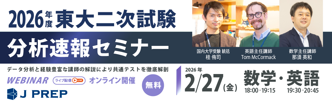 1月に開催した「共通テスト試験分析セミナー」に続き、東大二次試験を徹底解剖する J PREP 主催のオンラインセミナーを今年も開催します。