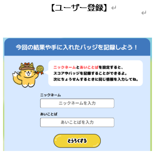 ○ ニックネームと合言葉を登録することで、今までの獲得バッジなどのデータを保持することができます。
