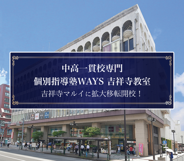 中高一貫校専門 個別指導塾WAYS吉祥寺教室(運営:株式会社メイツ)は、吉祥寺・三鷹エリアの生徒様・保護者様からの高まる学習ニーズにお応えするため、2026年2月20日(金)に「吉祥寺マルイ」内へ拡大移転することを決定いたしました。 WAYSとして全国で初めて「塾生200名」を突破した吉祥寺教室が、吉祥寺駅徒歩2分という抜群のアクセスを誇る新拠点にて、より広く快適な学習環境を提供します。