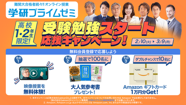 このキャンペーンをきっかけに、カリスマ講師陣のアツい映像授業を体験して(無料会員登録で100本以上の映像授業が見られます)、モチベーションアップしてください。新規で無料会員登録した高校1・2年生の中から、抽選で100名様にGakkenの学習参考書をプレゼントします。さらに、その当選者の中から抽選で10名様にAmazonギフトカード1万円分が当たるダブルチャンスも。皆さんのご応募をお待ちしています。
