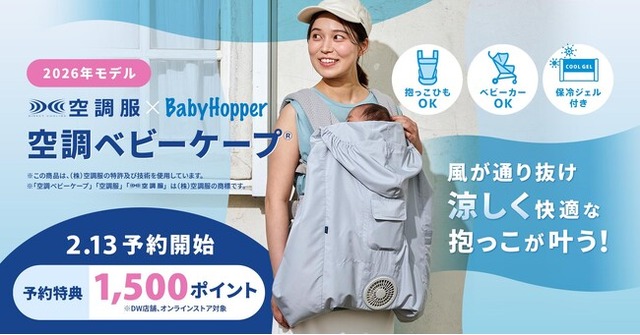 「BabyHopper(ベビーホッパー)」より、ファン付きウェアのパイオニア株式会社空調服との共同開発による暑さ対策グッズの決定版「空調ベビーケープ(R) (保冷ジェル付き)」を2026年3月13日に発売。これに先駆け、本日2月13日よりダッドウェイの店舗・オンラインストアにて予約販売を開始いたします。予約特典として1,500円分のポイントをプレゼント中です。