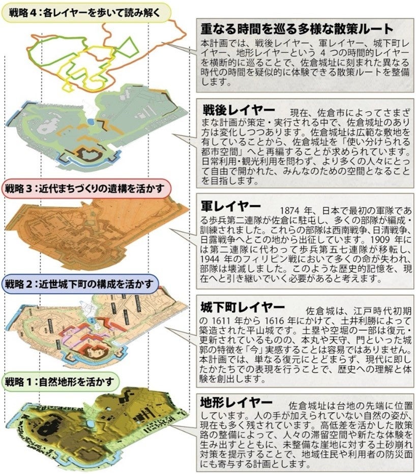 本提案では、佐倉城址が有してきた歴史や環境特性を丁寧に読み解きながら、地形や各時代のまちづくりの痕跡を体験的に理解するための、以下の4つの戦略を提示します。