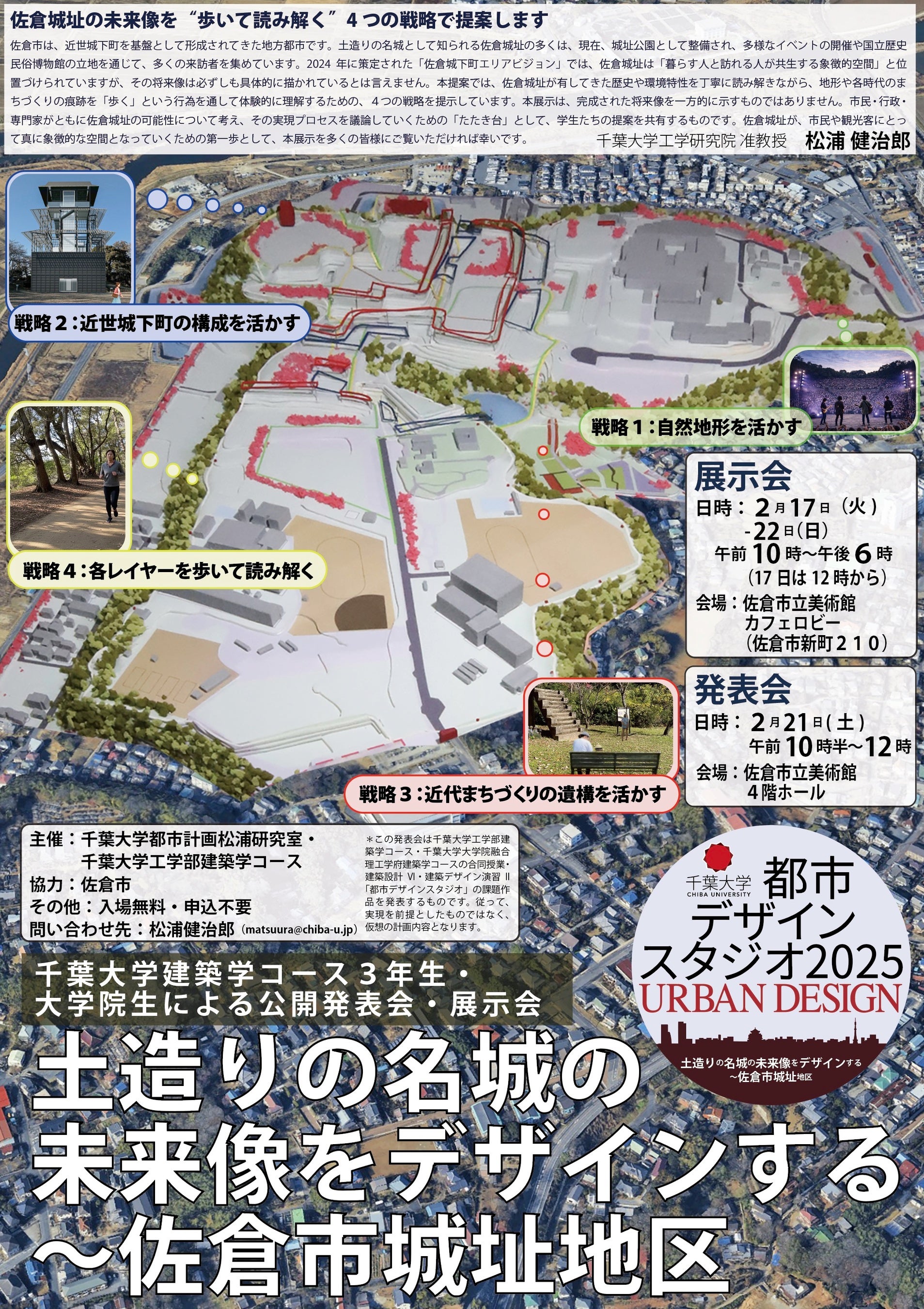 千葉大学工学部建築学コースの学部生・大学院生が、佐倉城址(じょうし)を対象に、地形や歴史的資源を「歩く」という行為を通して読み解く都市デザイン提案を発表・展示します。