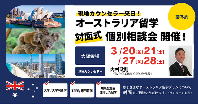 この説明会では、オーストラリア在住のスタッフが来日し、大阪にて対面、またはオンラインにて個別相談を実施。将来的な大学進学・留学から永住権取得・現地就職を見据えた留学プランについて、参加者の状況に応じて具体的にご案内いたします。