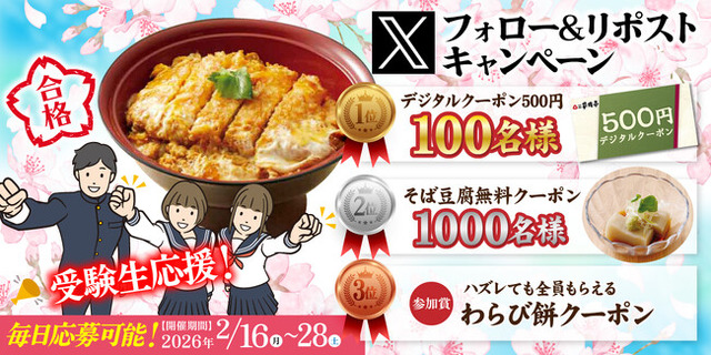 株式会社家族亭(本社:大阪府大阪市、代表取締役執行役員社長:坪山憲司)が運営するそば和食チェーン「家族亭」は、2026年2月16日(月) 午後8時より、家族亭公式Xで「家族亭デジタル 500円引きクーポン」が抽選で100名様に当たる「受験生応援」Xフォロー&リポストキャンペーンを開催いたします。家族亭の公式Xをフォローし、キャンペーンポストをリポストすることで参加ができ、当たりがその場ですぐに分かります。また、デジタル値引きクーポンの抽選に惜しくも外れた方も、1,000名様にそば豆腐無料クーポン当がたります。期間中は毎日応募できますので、この機会にご参加ください。