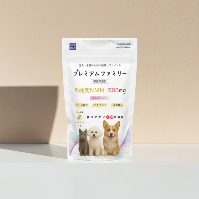 犬や猫は体調の変化や違和感を言葉で伝えることができません。しかし、 寝ている時間が増える ・ジャンプを控えるようになる ・動きがゆっくりになる ・毛並みや毛艶が変わる といった日常の変化は、年齢を重ねる中で少しずつ現れることがあります。こうした変化は「歳だから仕方ない」と見過ごされがちですが、健康について考えるきっかけになり得るサインでもあります。 プレミアムファミリーは、こうした日常の小さな変化に気づく視点を大切にし、特別なケアではなく、毎日の生活の中で無理なく健康を意識できる選択肢を提供したいという想いから開発されました。また、弊社は設立当初から人間用のNMNサプリメントを販売しており、まさにNMNのプロフェッショナルとも言えます。そして、今まで培ってきた知見を基に、愛犬・愛猫に最適なNMN配合のサプリメントを作りました。