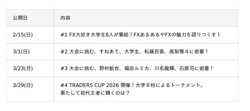 全4話を通じて、大学生トレーダーによるFXトーナメントバトルに密着していきます。わっきゃいさんの「大学生のFXを盛り上げたい」という熱い想いから決定したバトルに対し、大学生トレーダーたちも本気のトレードで応えます。バトルの結果は、4話目の最終回にて発表となります。