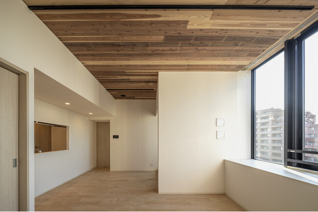 住戸の内装は、RC床スラブ(鉄筋コンクリート床)の型枠に天然木を使用し、そのまま仕上げ材として活かす「ハイウッドスラブ」を採用したことや、通常は天井側に下がる梁を床側に立ち上げて設置する工法である「逆梁構法」を採用したことで、住戸リビング・ダイニングは賃貸マンションとしては類例の少ない天井高さ約2.8mとなる天然木天井を実現しました。窓側に下天井がないため視界が開け、空が大きく感じられる、明るく開放的な居住空間となっています。