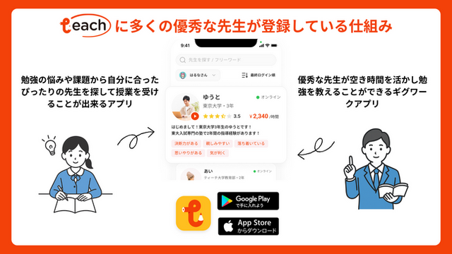 「Teach」は、家庭教師の先生を自分で選び、オンラインで授業を受けられる家庭教師マッチングアプリです。