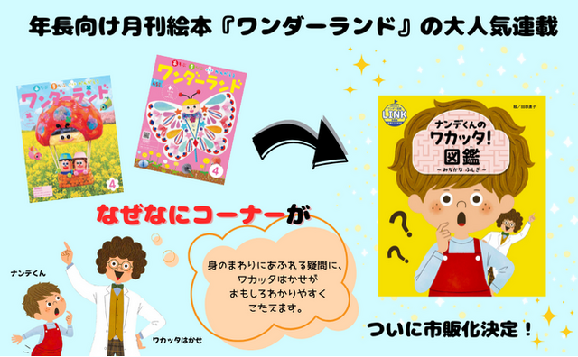 幼稚園・保育園などに通う子どもたちに毎月お届けする月刊絵本『ワンダーランド』(年長児向け)にて、2024年~2025年で連載していた「なぜなにコーナー」。園の先生方より大好評いただき、この度まとめ一冊の本として発売が決定しました! 月刊絵本は、園の先生方にご監修いただいており、お子様が理解しつつ、楽しく読める誌面になっています。