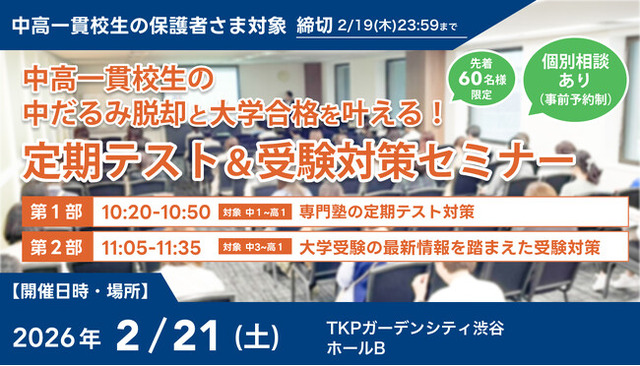 中高一貫校専門 個別指導塾WAYS(運営:株式会社メイツ、本社:東京都新宿区)は、2026年2月21日(土)、TKPガーデンシティ渋谷にて、中高一貫校に通う中学生・高校生の保護者様を対象とした『中高一貫校生の「中だるみ脱却」と「大学合格」を叶える!定期テスト&受験対策セミナー』を開催いたします。