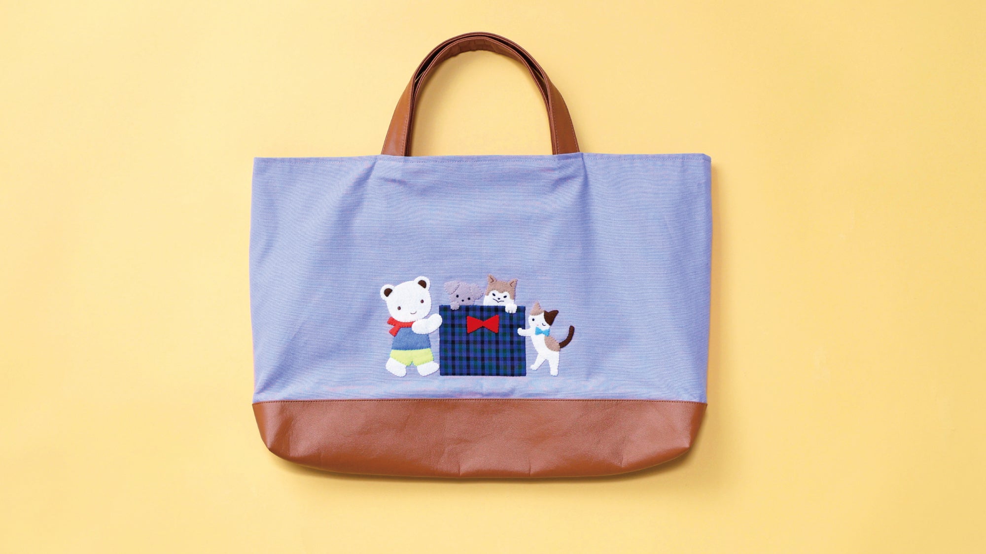 両面でストーリーがつながるバイカラーのデニムバッグ。第1話となるブルーの面では、クマちゃんのお誕生日のお祝いにやってきたお友達の様子を表現しています。第2話となるピンクの面では、お友達と一緒にお花畑でお散歩をしている様子を表現しました。合成皮革部分はピンクとブルーと調和するブラウンを選び、お花畑の土に見立てています。