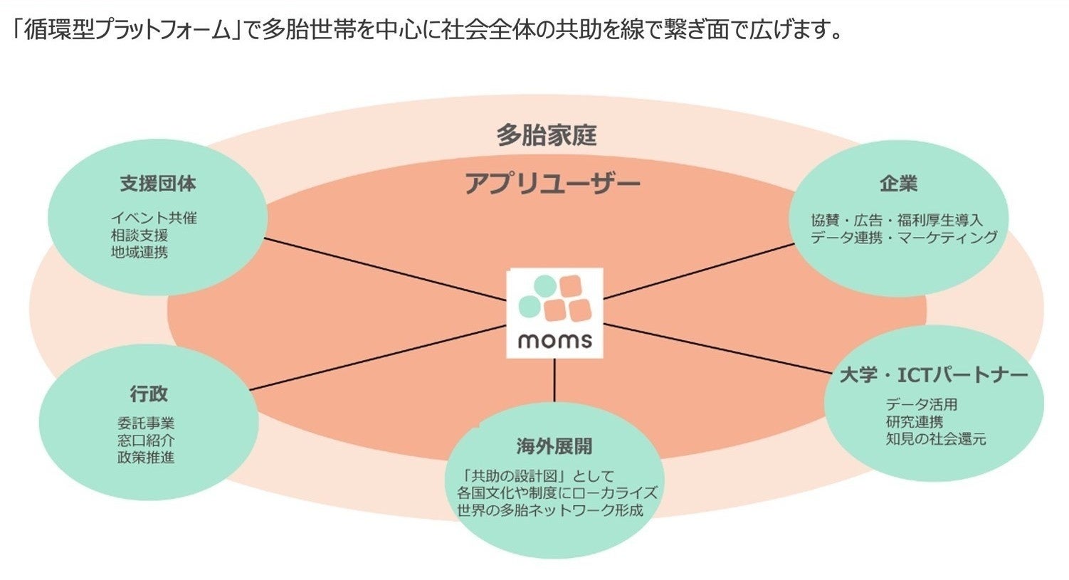 momsは多胎家庭のウェルビーイングを支えるプラットフォームです。感情的な共感にとどまらず、情報を集約し、つながりを生み、データを活用し、家庭・企業・行政を横断する「社会インフラ」として実装していくことを目指しています。
