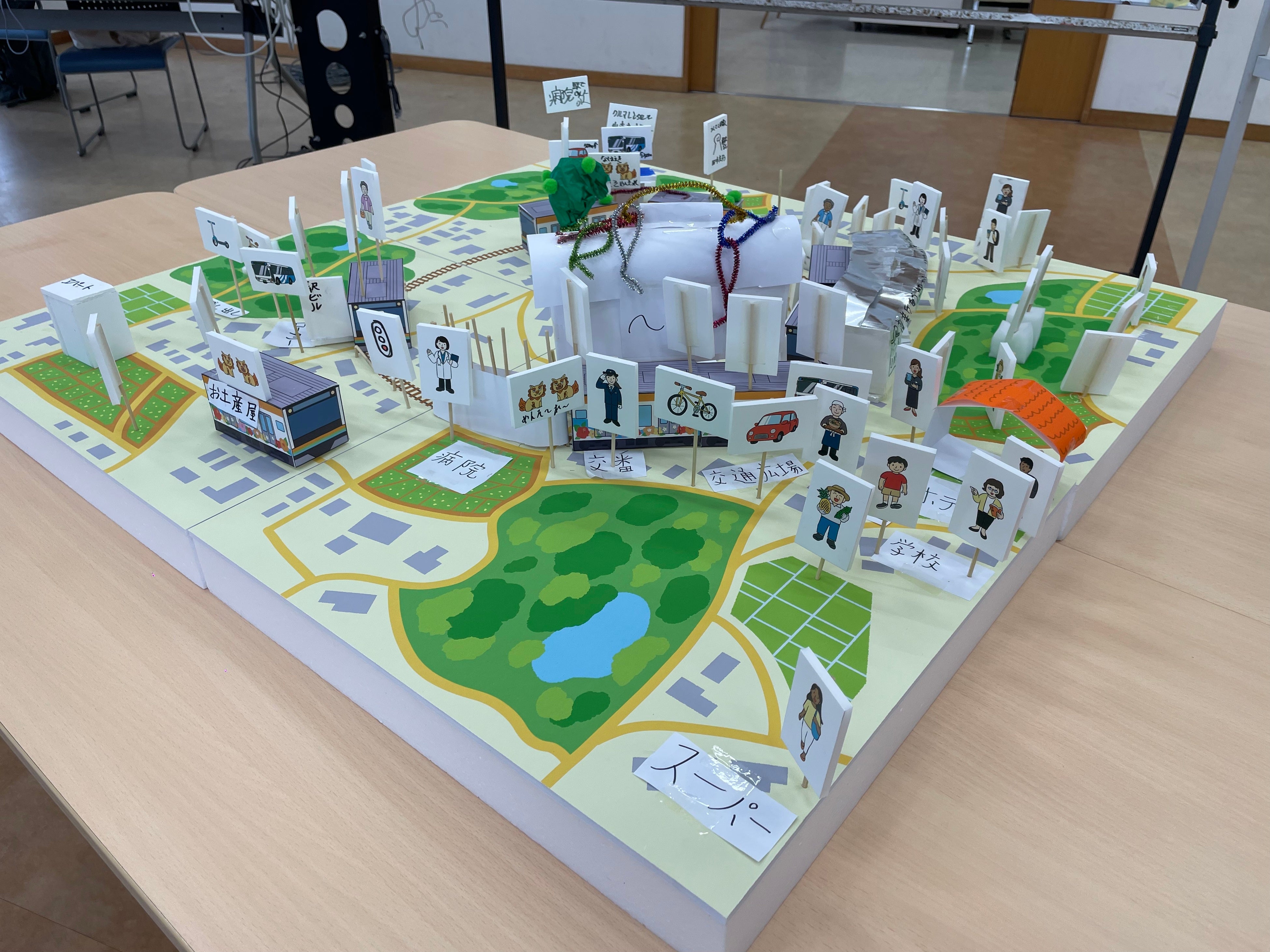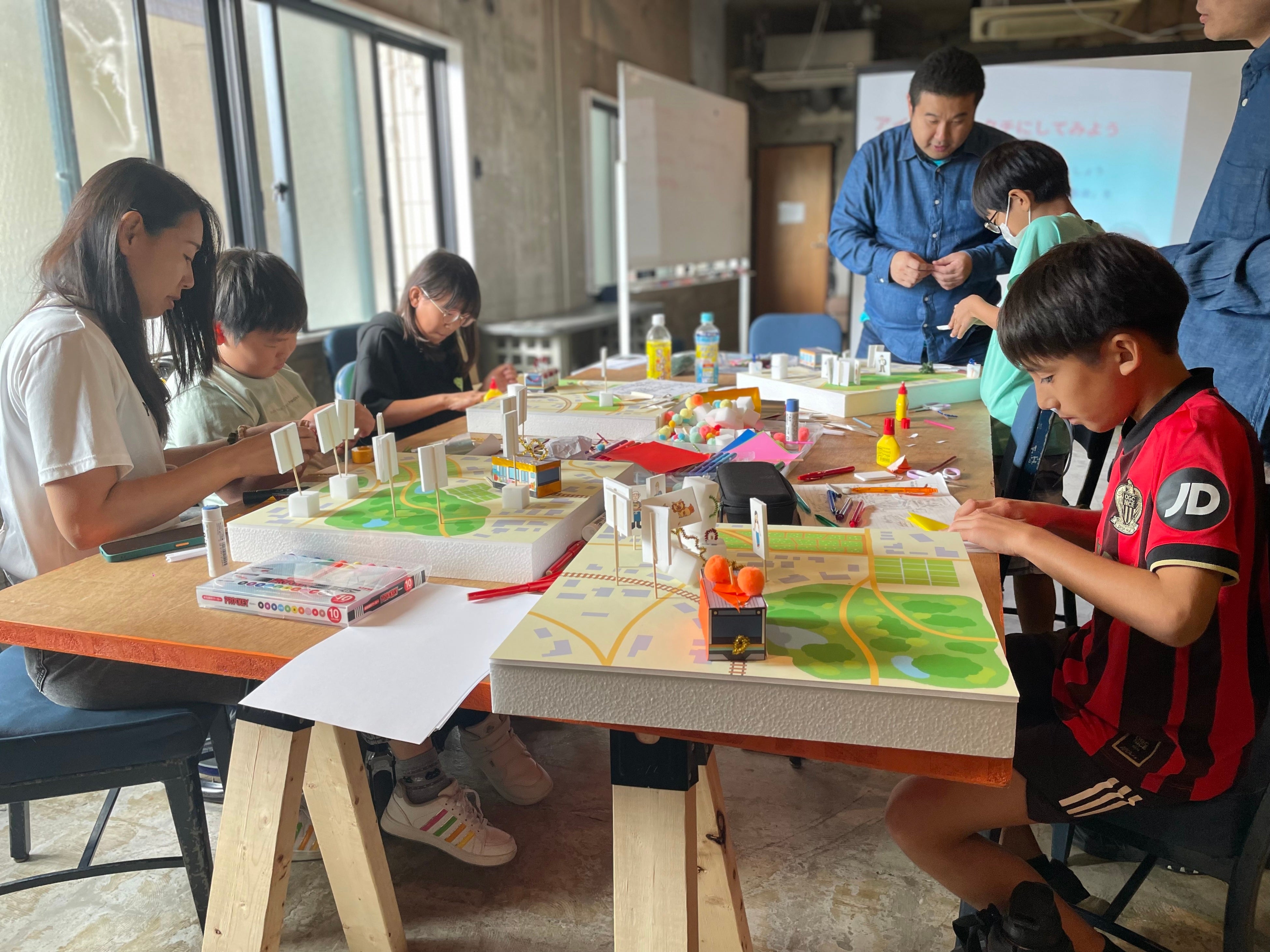 本ワークショップでは、沖縄県内在住の小学5・6年生が参加し、「もし沖縄本島を南北に縦断し、那覇から名護までを約1時間で結ぶ鉄軌道ができたら、沖縄のまちはどう変わる?」をテーマに、専門家の話を聞きながらグループで話し合い、模型や制作物を使って未来のまちを表現しました。