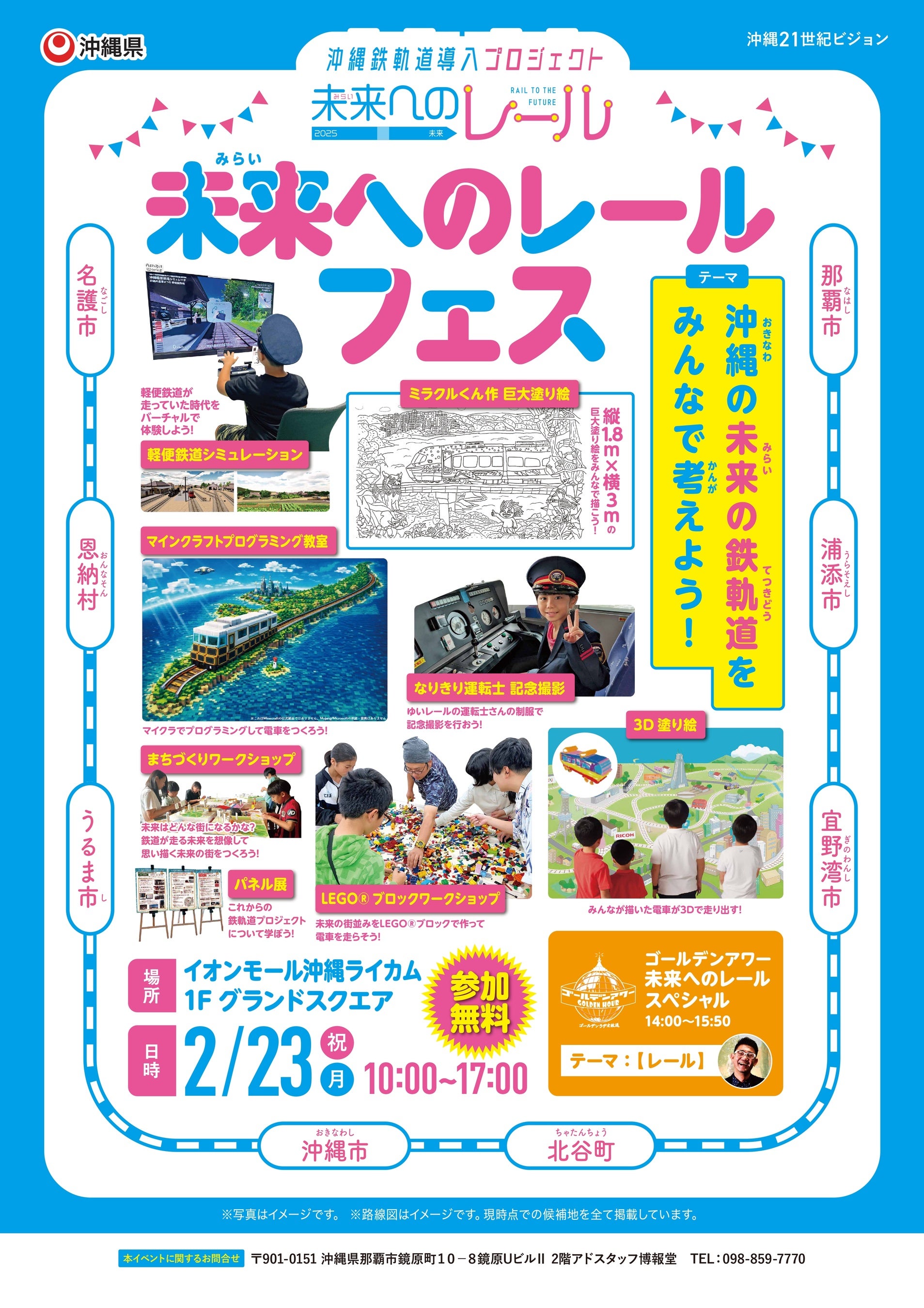沖縄県(企画部交通政策課公共交通推進室)では、交通課題の解決に向けて進めている「鉄軌道導入※」に関する取り組みを、より多くの県民の皆さまに知っていただき、未来の沖縄について一緒に考えるきっかけとして、体験型PRイベント「未来へのレールフェス」(以下、本イベント) を2月23日(月・祝)、イオンモール沖縄ライカムにて開催します。