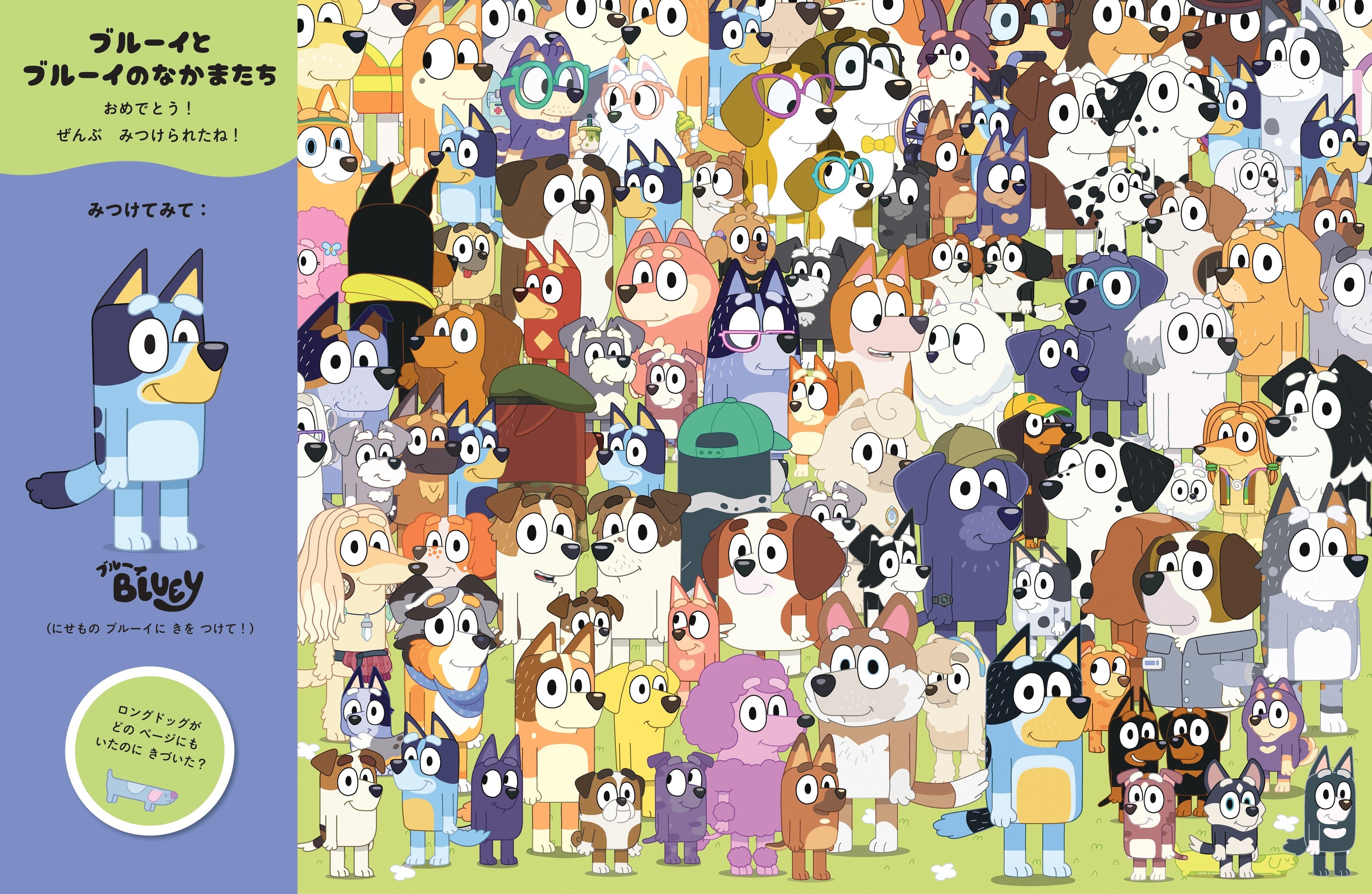 [画像3: https://prcdn.freetls.fastly.net/release_image/13640/3569/13640-3569-a44de806317f115bbc074aae4fb51924-3900x2524.jpg?width=536&quality=85%2C75&format=jpeg&auto=webp&fit=bounds&bg-color=fff ]ブルーイのおうちの庭、お部屋、ビーチ、学校、キャンプ場……など、アニメでもお馴染みのカラフルなシーンが登場。その中に隠れたブルーイやビンゴ、さらにさまざまな隠しアイテムをみんなで探してみよう!