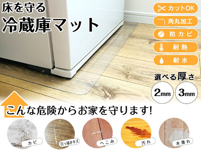 冷蔵庫マットとしての利用はもちろん、洗濯機の下、デスク下のチェアマット、お子様の食べこぼし対策、ペットのトイレ周りなど、撥水・防カビ・滑り止め(裏面エンボス加工)を活かした幅広い用途でご活用いただけます。[画像3: https://prcdn.freetls.fastly.net/release_image/68824/274/68824-274-35975c46567028ed0fb0ae256c6ac655-2200x1650.jpg?width=536&quality=85%2C75&format=jpeg&auto=webp&fit=bounds&bg-color=fff ]